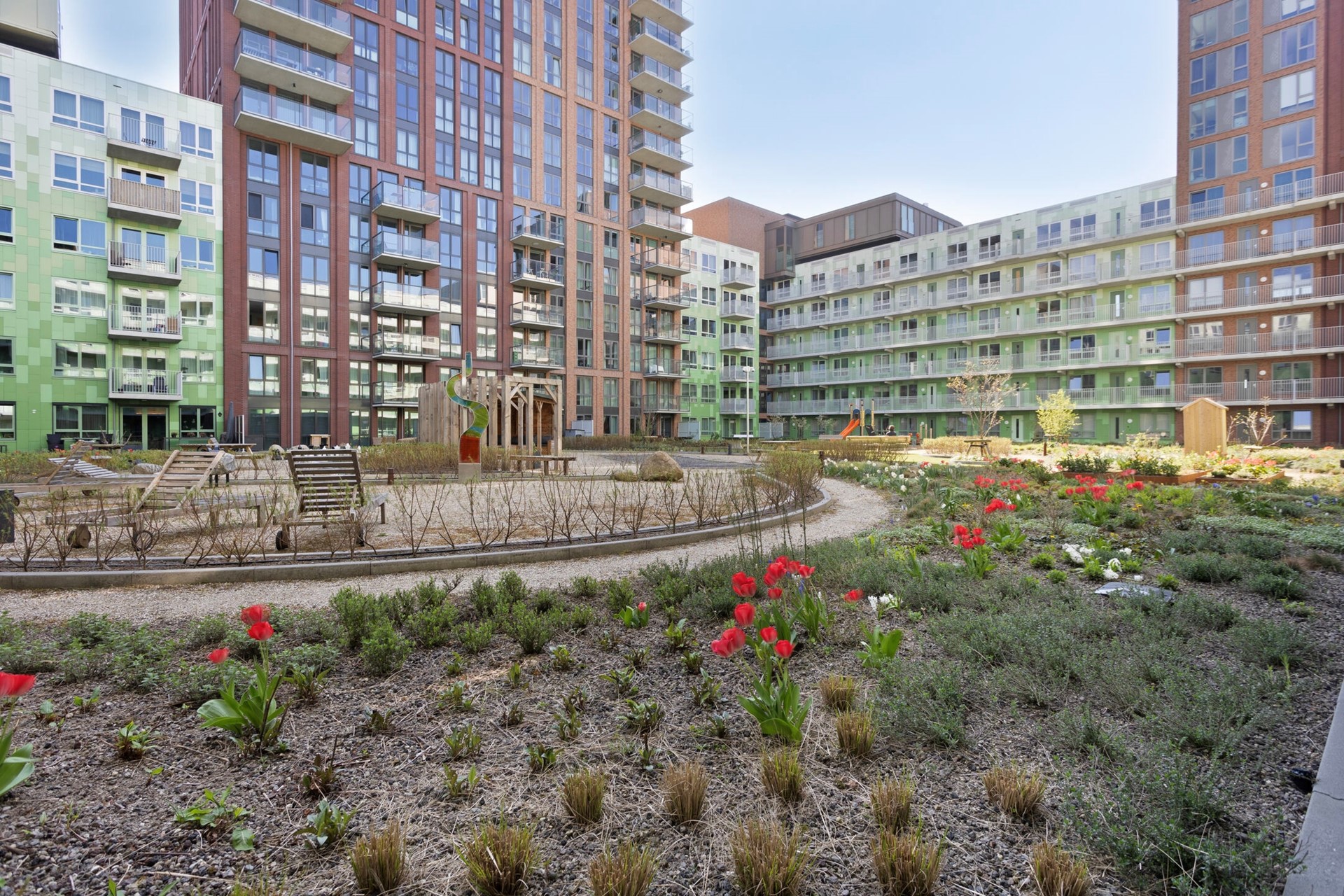 Er is een enorme gemeenschappelijke binnentuin, een groene oase waar je samen kunt komen met andere bewoners, en dat midden in de stad!