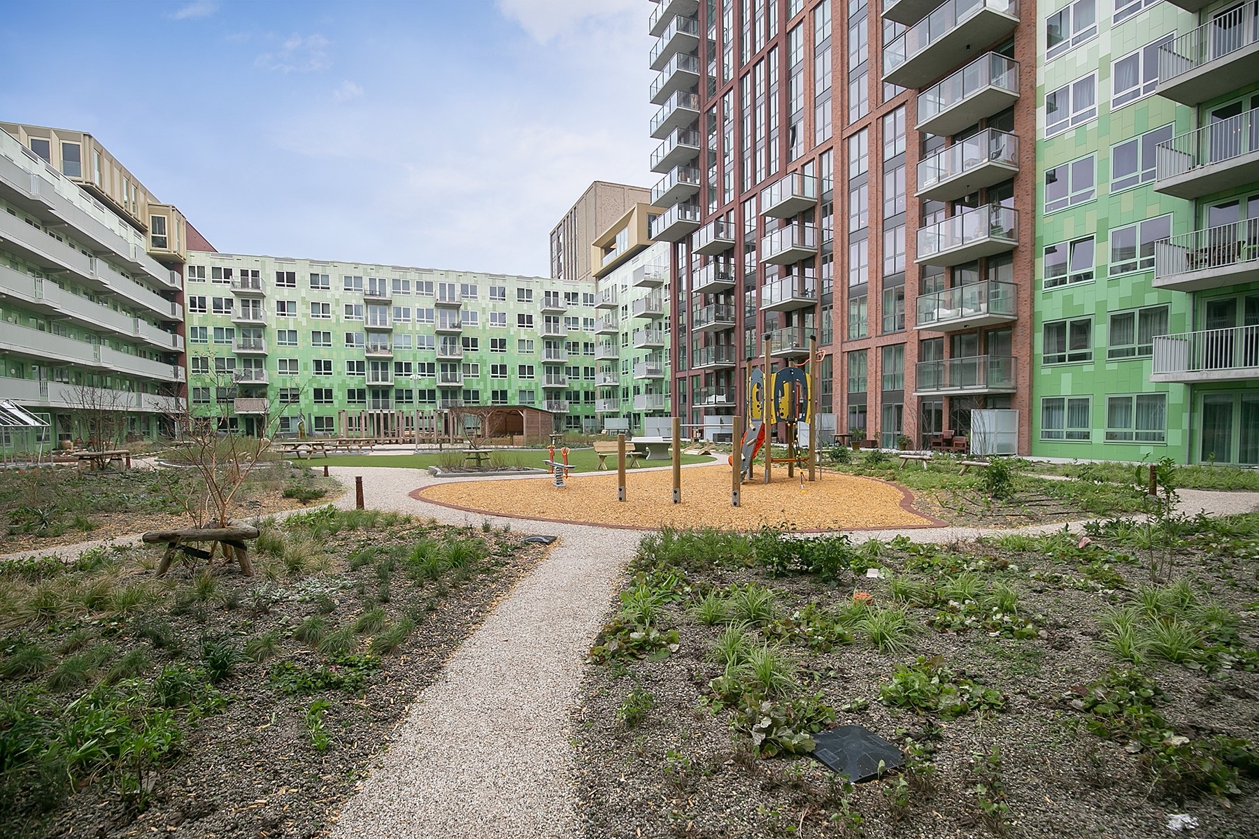 Er een enorme gemeenschappelijke binnentuin, een groene oase waar je samen kunt komen met andere bewoners en de kinderen zorgeloos kunnen spelen en dat midden in de stad!