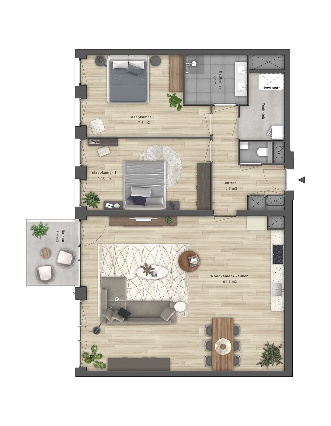 Binnen in het appartement tref je een ruime hal die toegang geeft tot alle vertrekken. De lichte woonkamer met grote raampartijen zorgt voor een open en prettige sfeer. De open keuken is luxe uitgevoerd en voorzien van moderne inbouwapparatuur, perfect voor koken én gezelligheid.