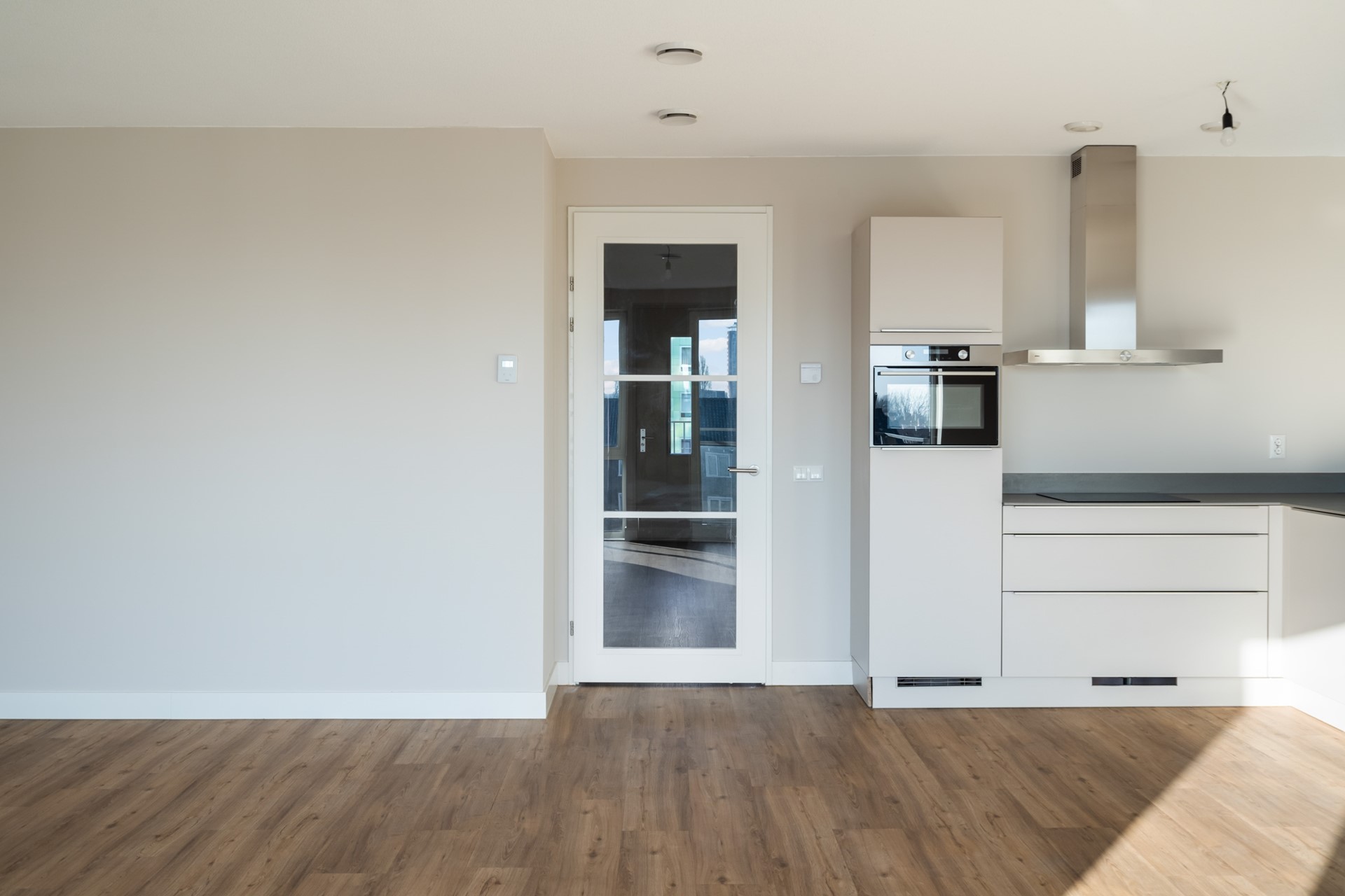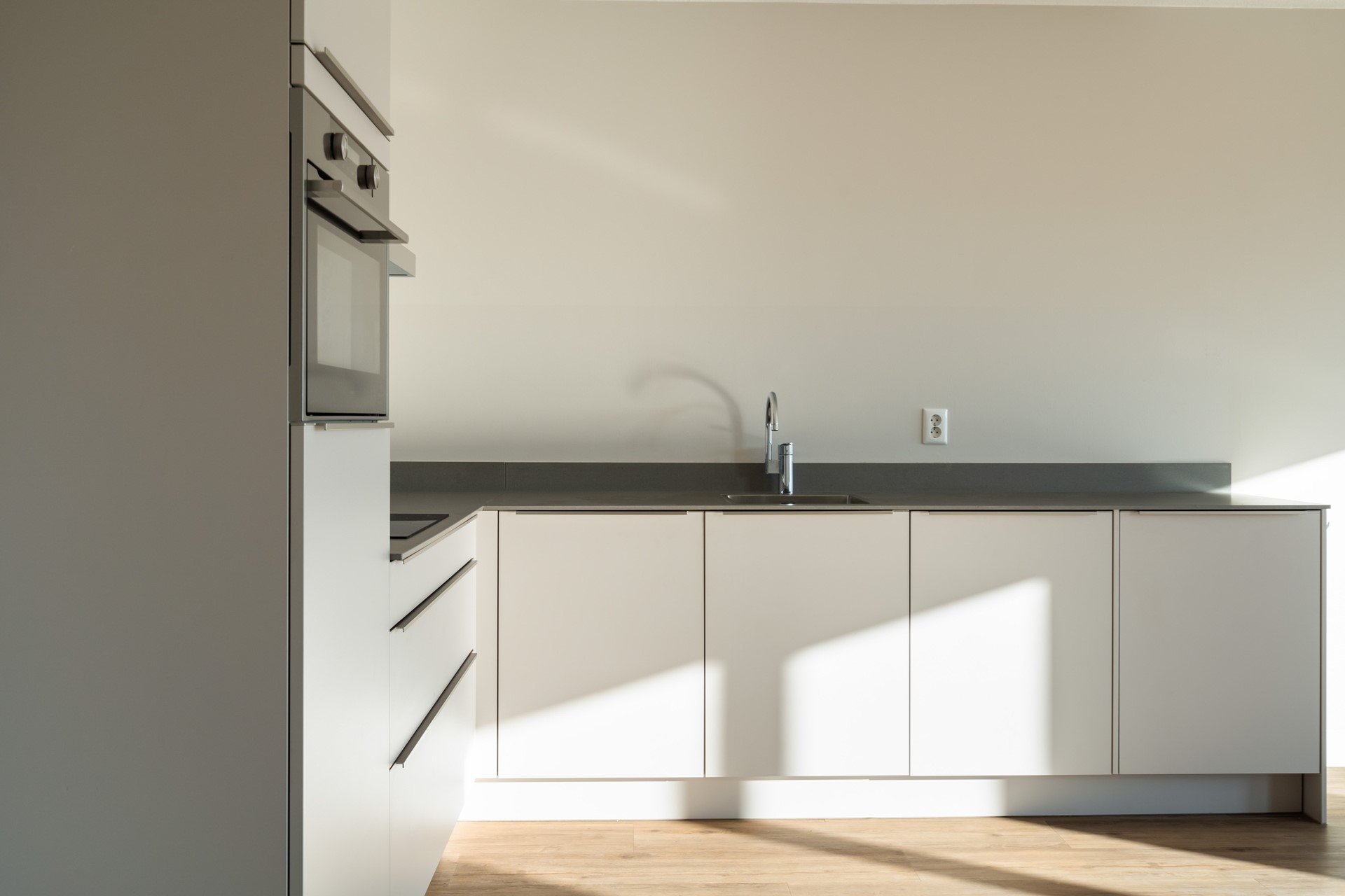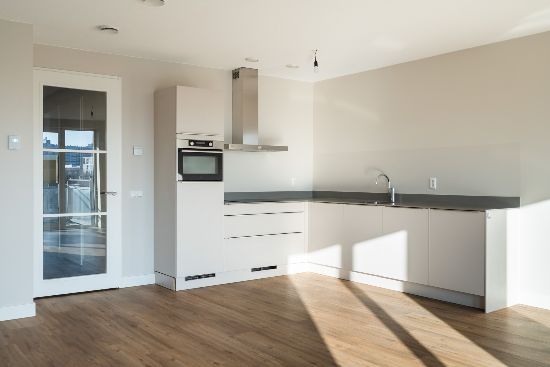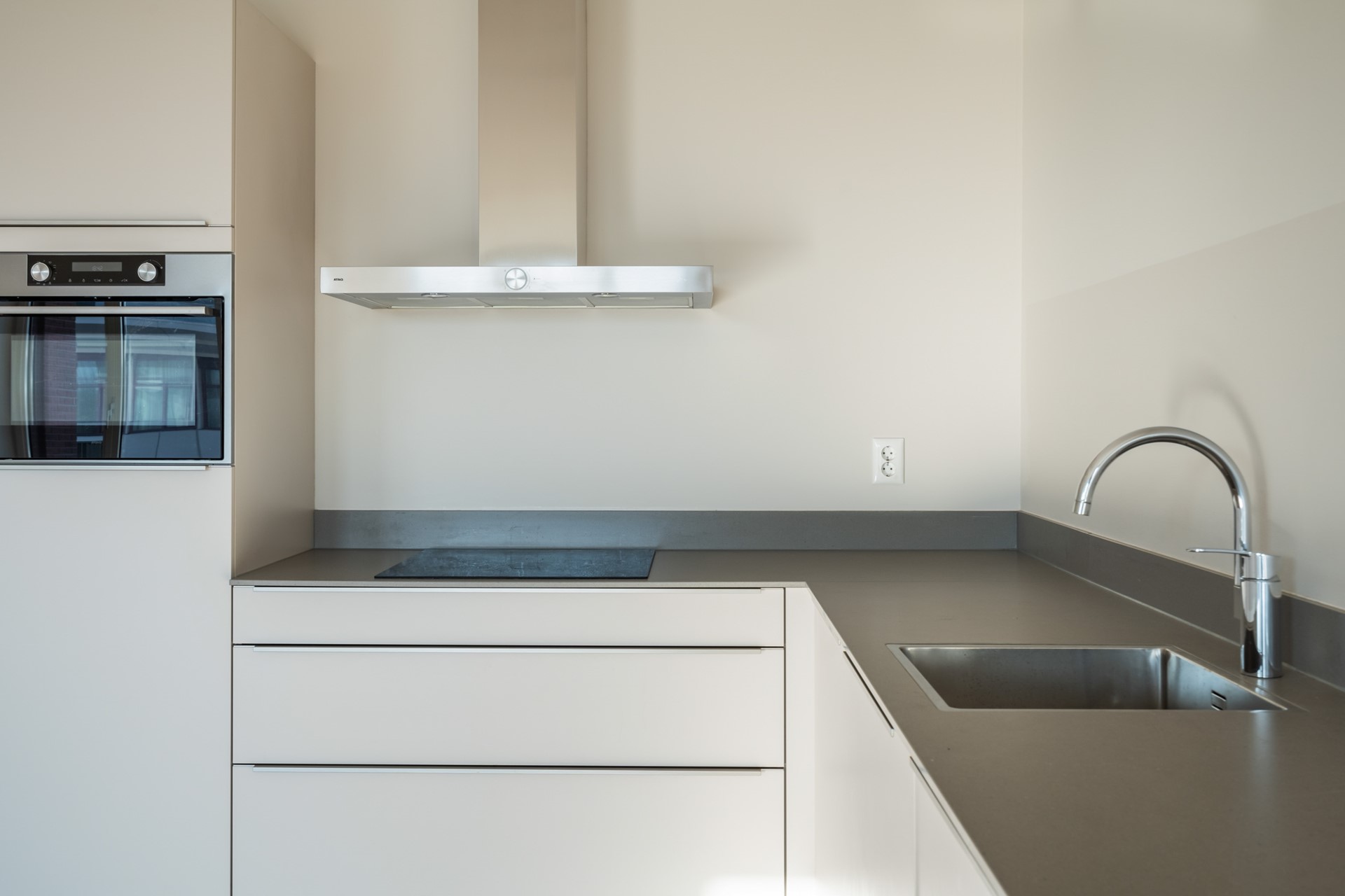 De keuken is strak uitgevoerd en voorzien van inbouwapparatuur: koelkast, vriezer, vaatwasser, combi-oven-magnetron en inductiekookplaat. De afwerking is modern en tijdloos en sluit naadloos aan bij de rest van het appartement.