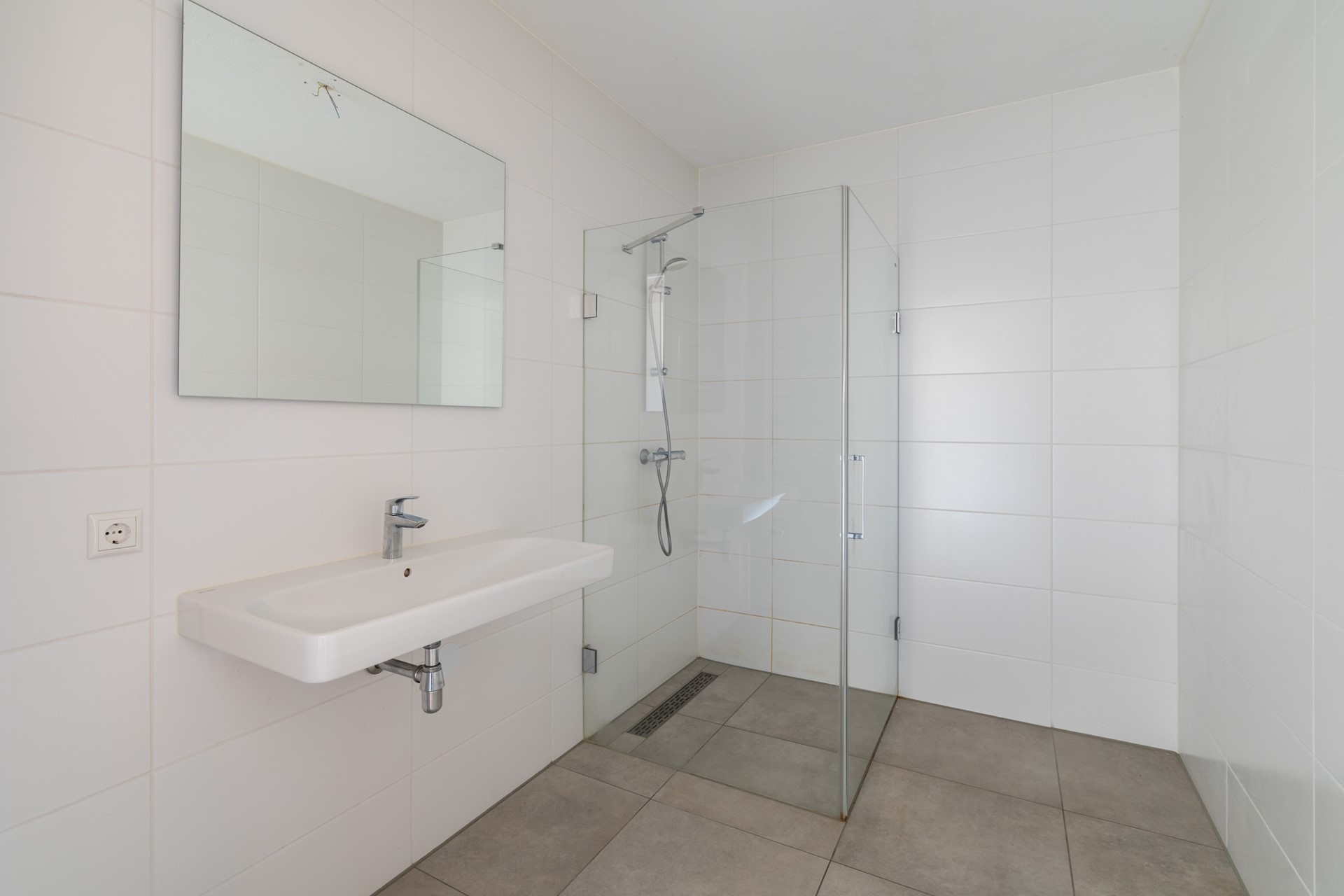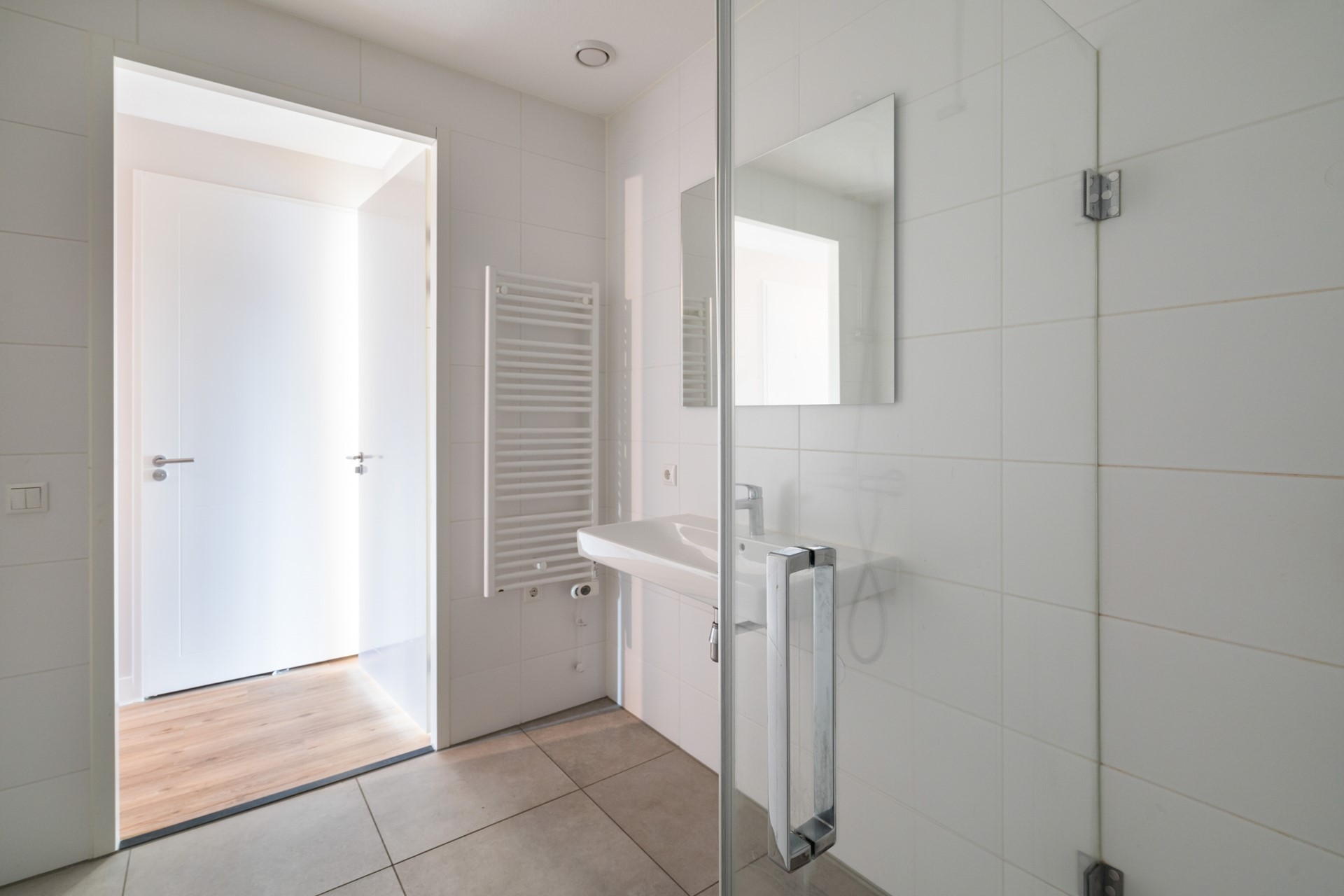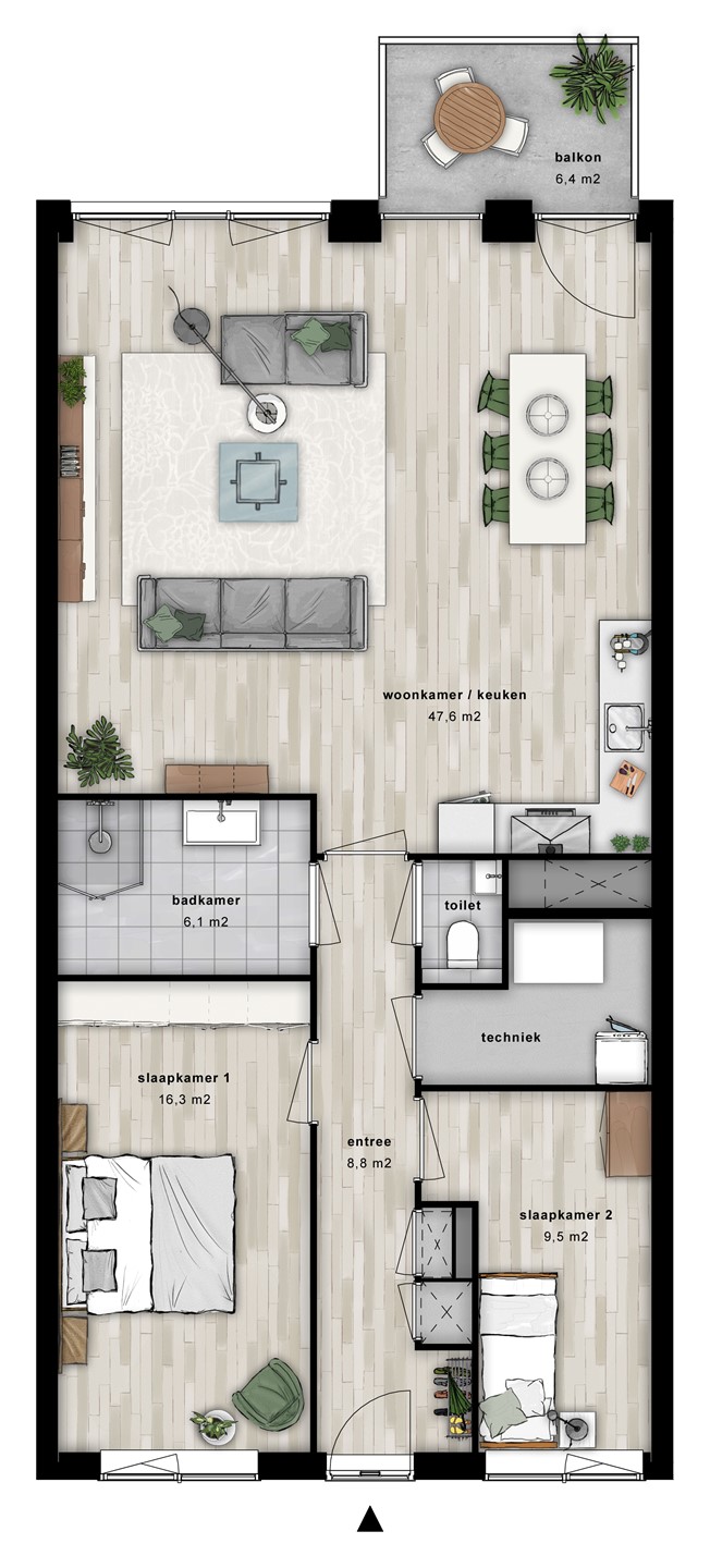Het appartement beschikt over twee ruime slaapkamers en een interne berging met aansluitingen voor wasmachine en droger en extra opbergruimte. De badkamer is uitgevoerd in neutrale tinten en voorzien van een inloopdouche en wastafelmeubel. In de hal bevindt zich een separaat toilet.