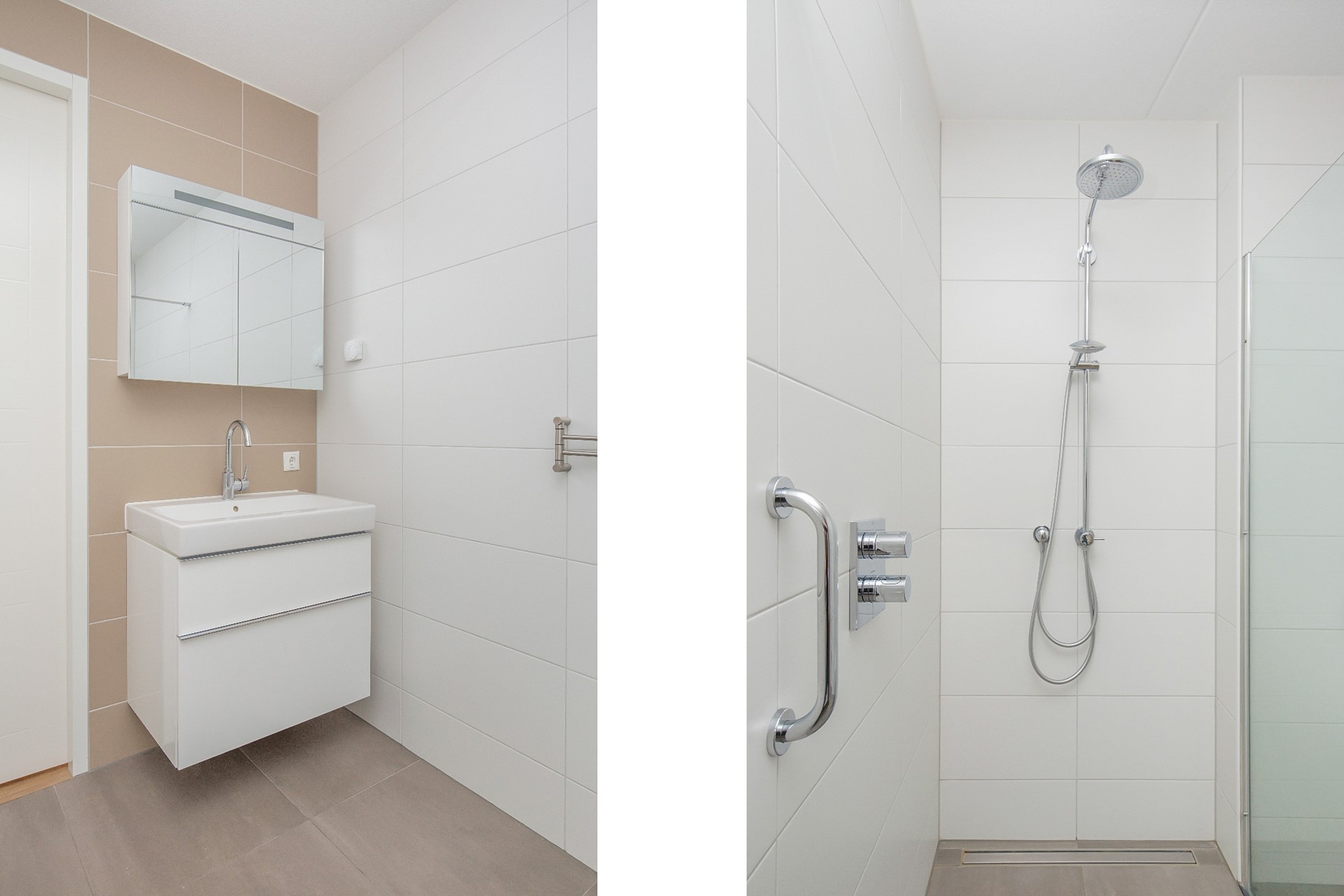 De luxe keuken is uitgevoerd in een witte kleur met een donker composiet werkblad en voorzien van moderne inbouwapparatuur: koelkast, aparte vriezer, vaatwasser, inductiekookplaat en combi-oven. De badkamer is modern afgewerkt met witte en warme taupe-tinten en beschikt over een luxe wastafelmeubel, douchewand, draingoot, thermostaatkraan, douche en een tweede toilet. Tevens is er een kluis aanwezig voor uw persoonlijke bezittingen.