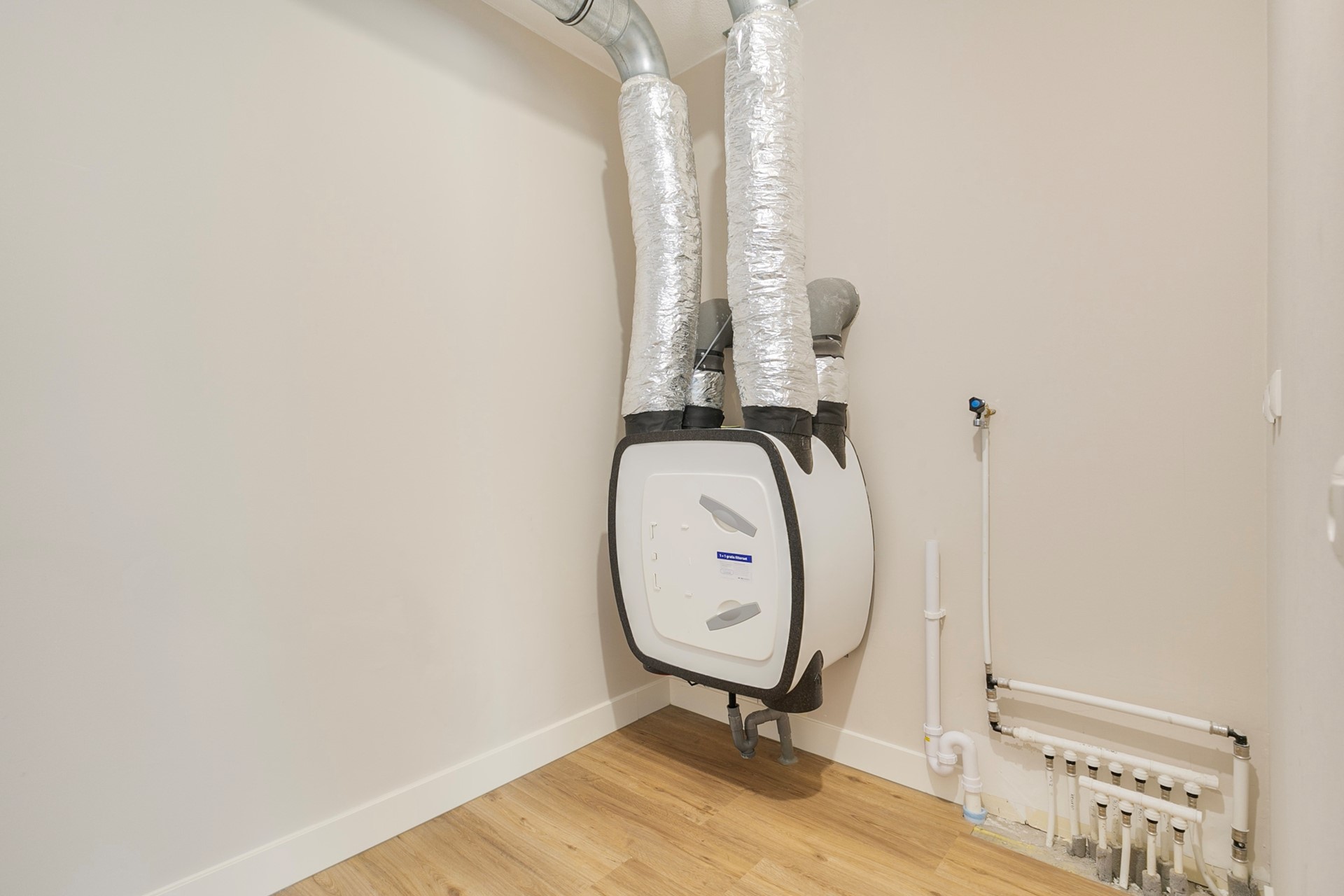 - Warmtepomp voor verwarming en koeling (huur van de warmtepomp circa € 120,- per maand, exclusief verbruik);