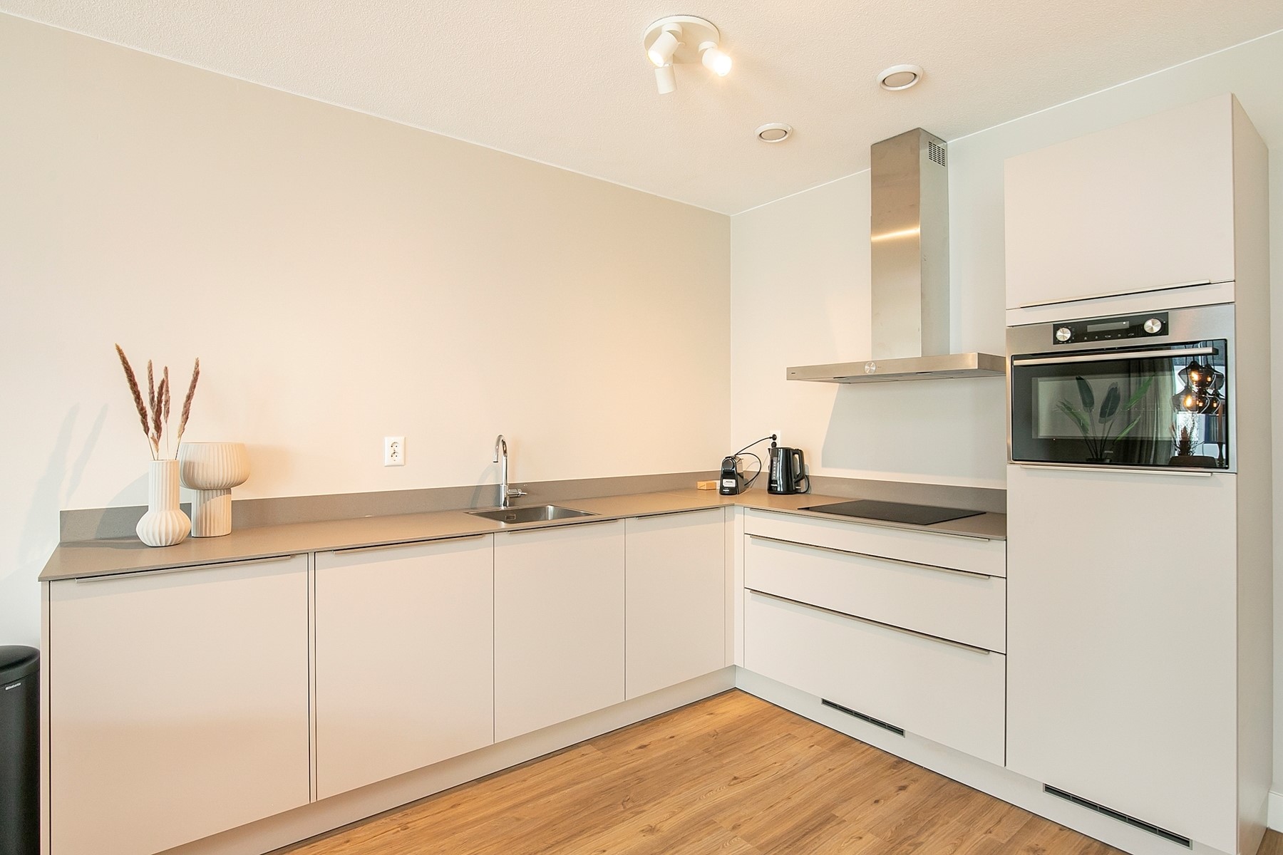 De moderne keuken is voorzien van alle inbouwapparatuur die je nodig hebt, zoals een combi-oven, vaatwasser, koelkast, vriezer en een elektrisch fornuis met afzuigkap. Verder zijn er diverse keukenbenodigdheden aanwezig zoals een koffiezetapparaat en waterkoker.