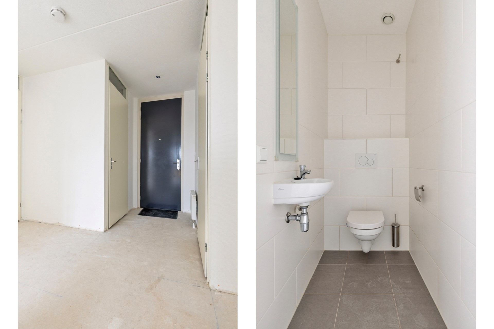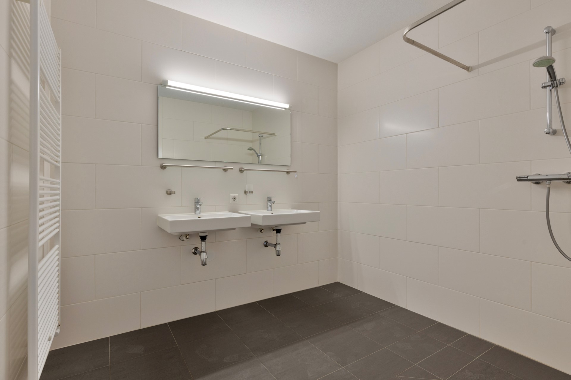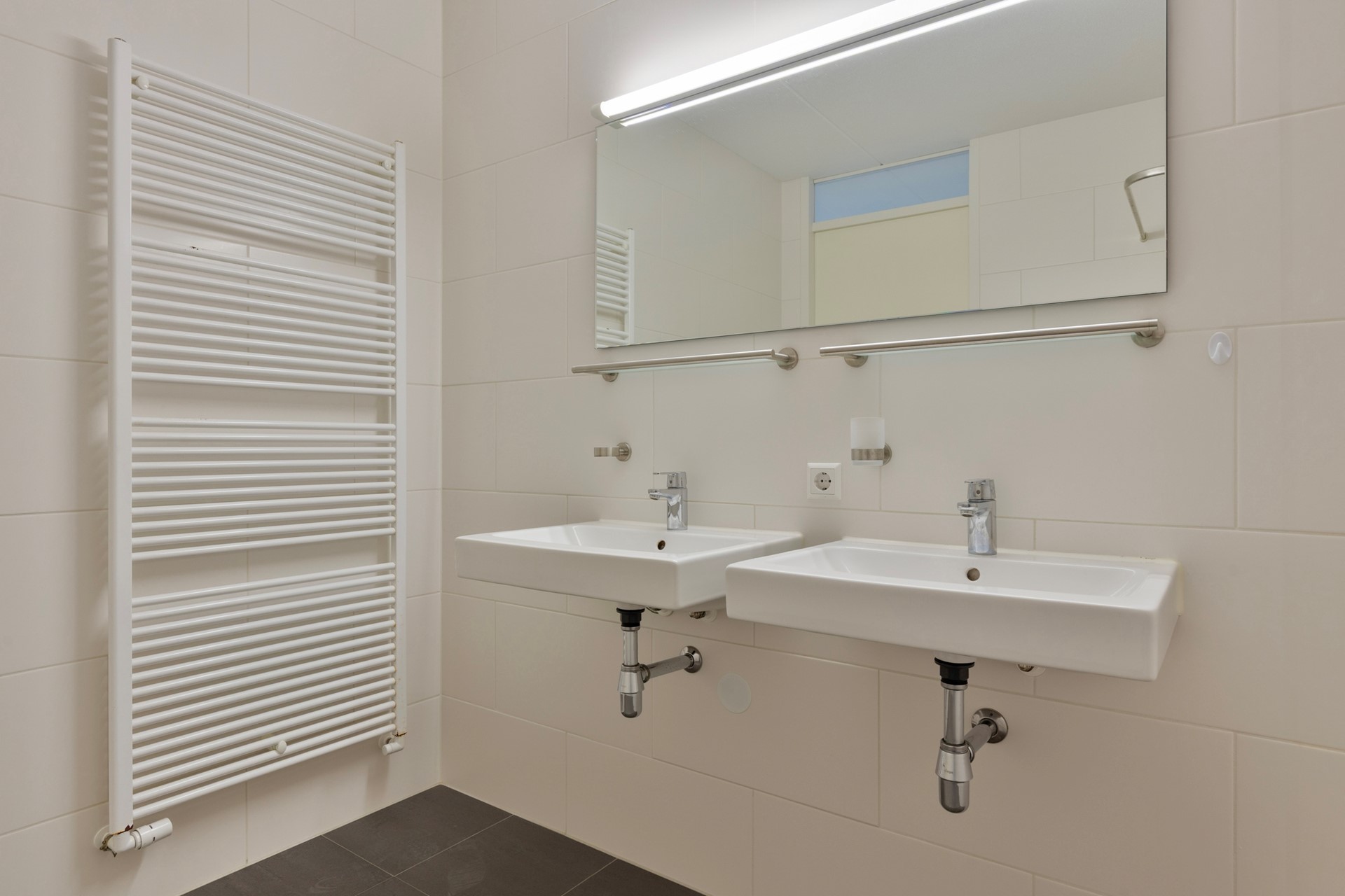 Vanuit de hal bereikt u de hoofdslaapkamer en een tweede slaapkamer, welke zich uitstekend leent als werk- of studeerkamer, logeerkamer of inloopkast. De badkamer is modern afgewerkt en beschikt over een ruime inloopdouche en een dubbele wastafel. Het separate toilet met fontein is, net als de badkamer, uitgevoerd in stijlvolle grijs- en wittinten.